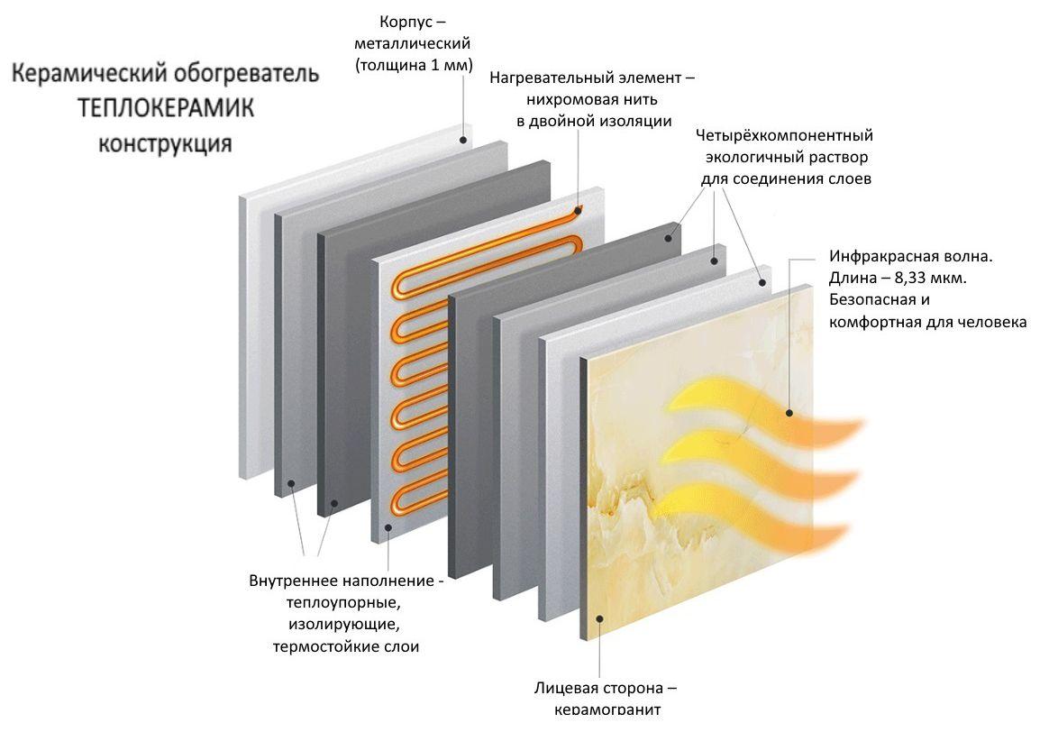Конвекційні керамічні обігрівачі – нагрівальний прилад, який поєднує в собі інфрачервоний і конвекційний принципи роботи, створений з метою прискореного обігріву приміщення. Нагрівальний елемент гріє кераміку, та у свою чергу віддає тепло приміщенню – інфрачервоний обігрів. За рахунок різниці температур внутрішньої та зовнішньої стінки, а також конструкції коробки досягається циркуляція повітряних мас –конвекція.